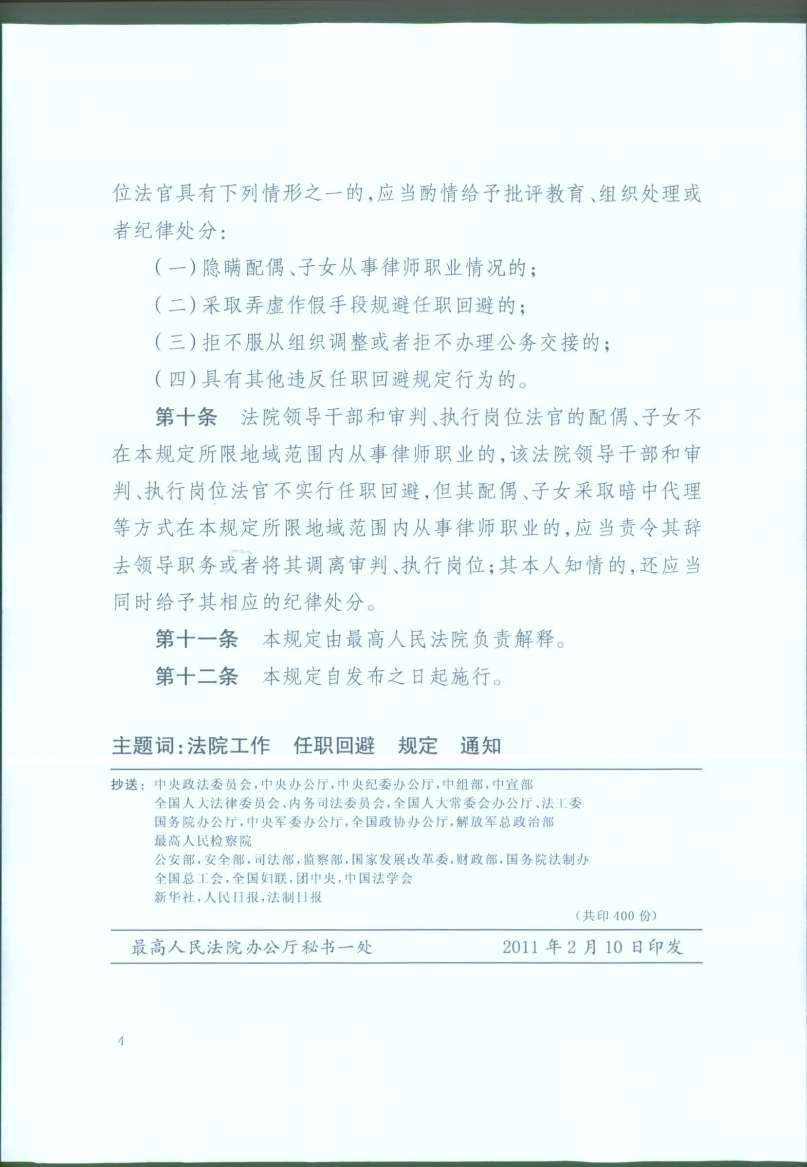 最高人民法院印发《关于对配偶子女从事律师职业的法院领导干部和审判执行岗位法官实行任职回避的规定(试行)》的通知